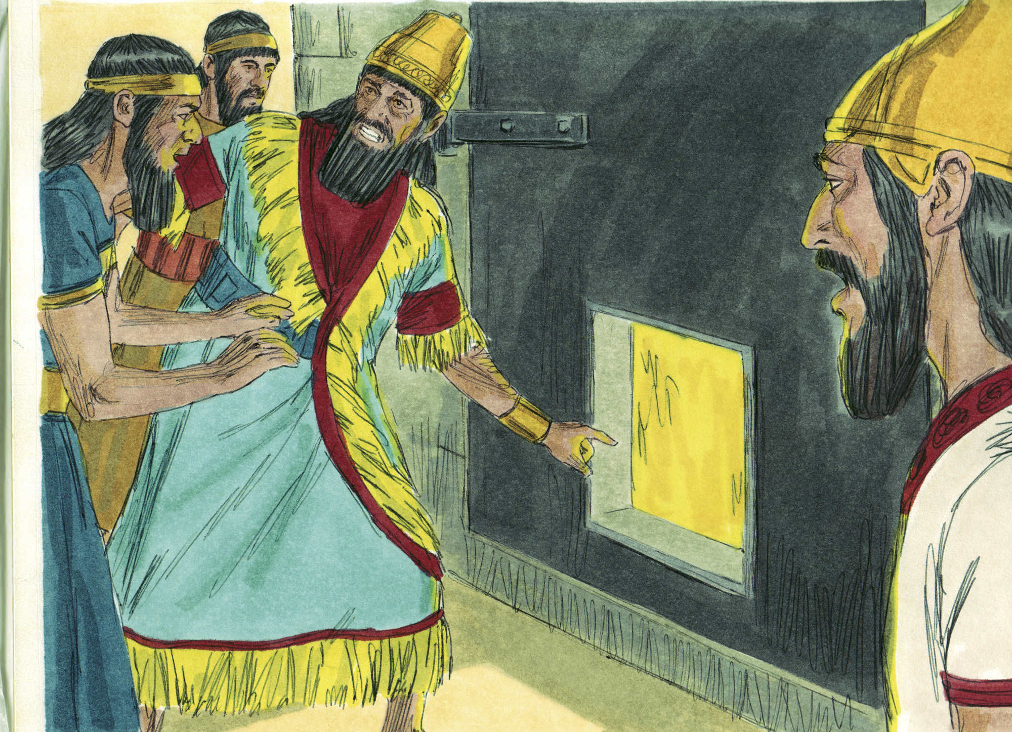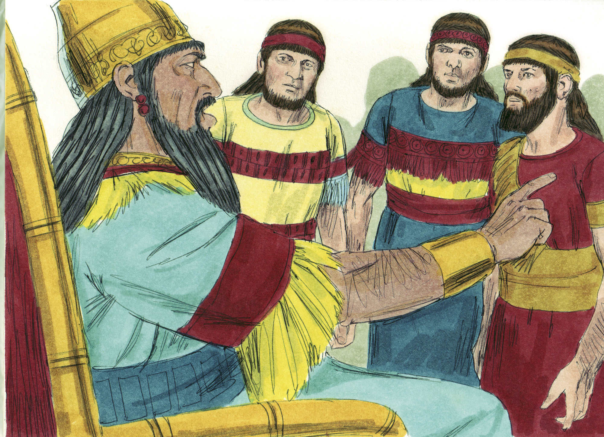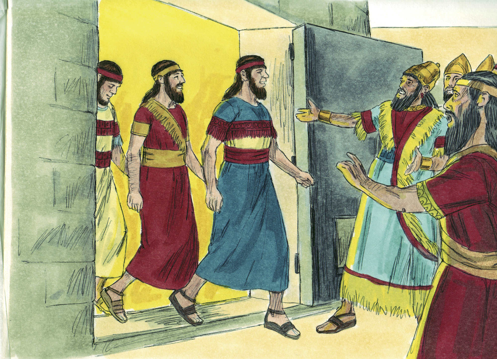 | So the time of the party began, the horns were blown. Everyone gathered to worship the statue. Everyone came and bowed before the idol, except for three men | ![]() |