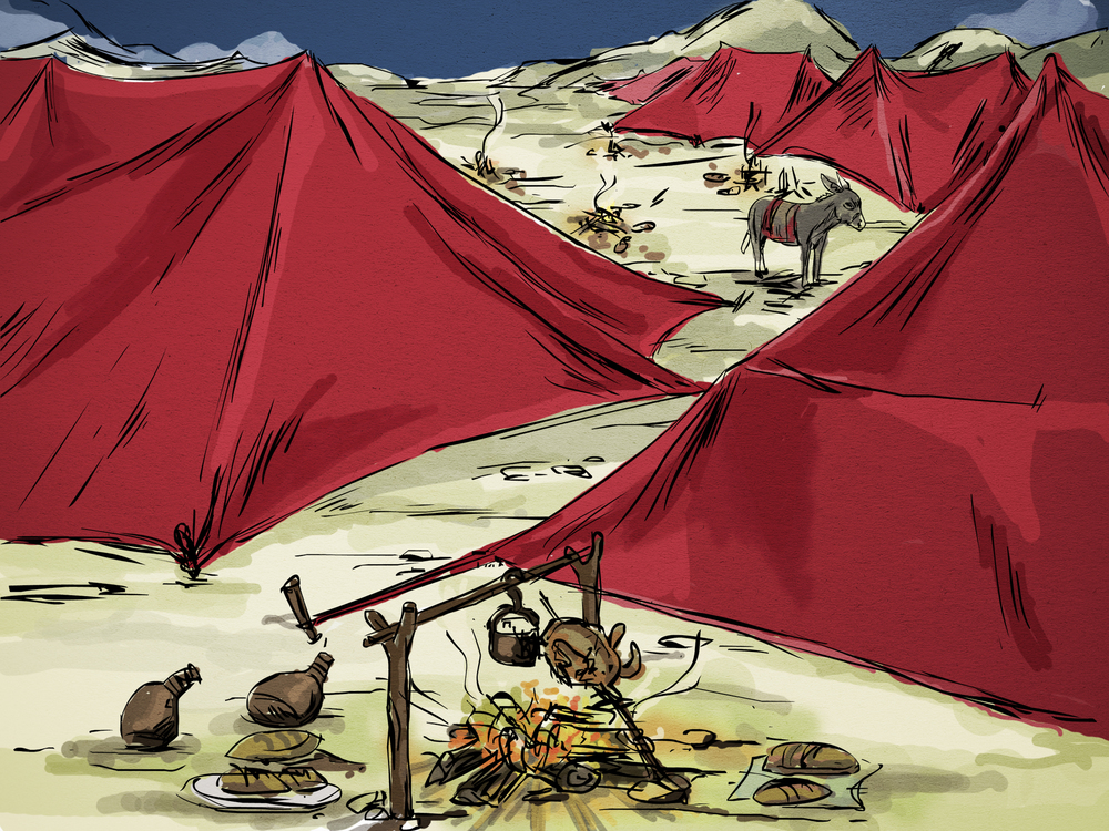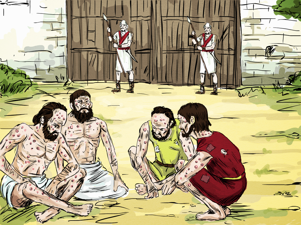 | Meanwhile, there were four lepers who lived at the gates of the city. They decided that they would go into the enemy camp and plead for mercy. |
